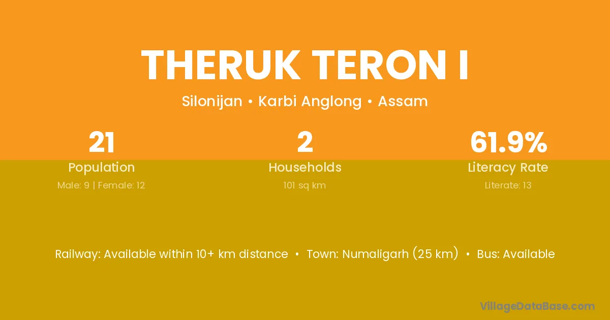 Numaligarh (25 km) is the nearest town to Theruk Teron I village for major economic activities and is located approximately 25 km away.
