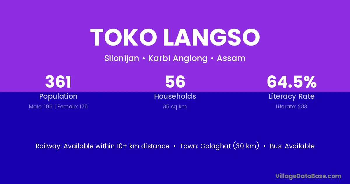 Golaghat (30 km) is the nearest town to Toko Langso village for major economic activities and is located approximately 30 km away.