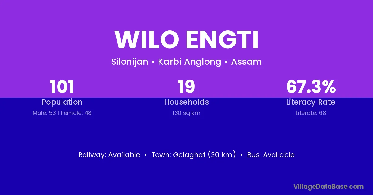 Wilo Engti village has a total population of 101 people, of which 53 are males and 48 are females.
