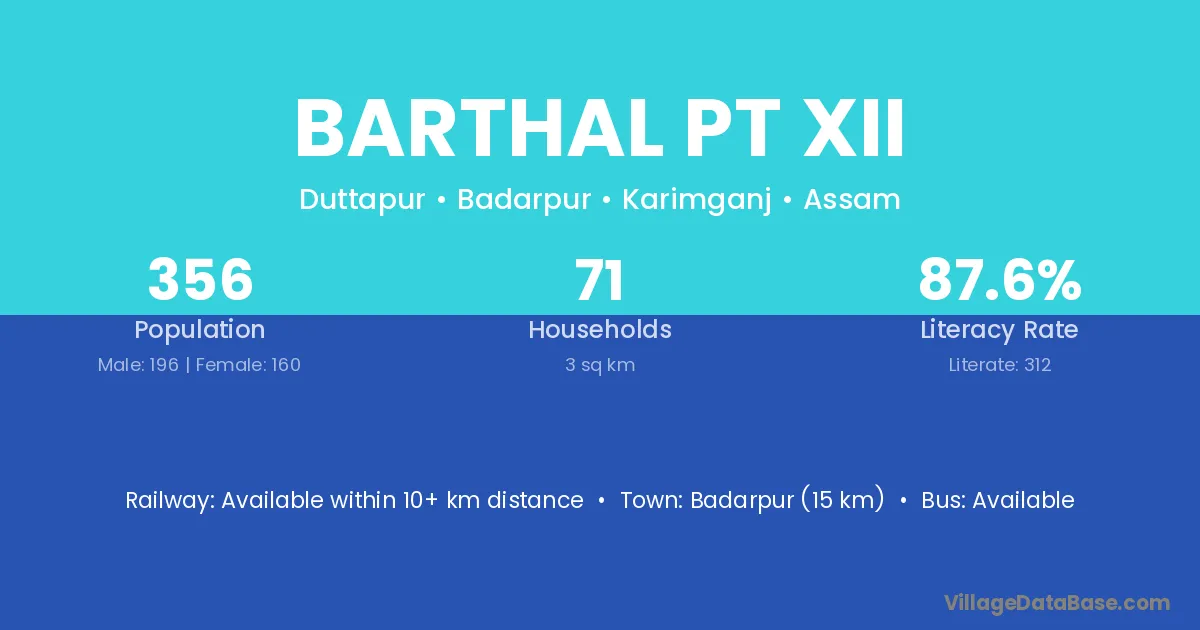 Badarpur (15 km) is the nearest town to Barthal Pt Xii village for major economic activities and is located approximately 15 km away.