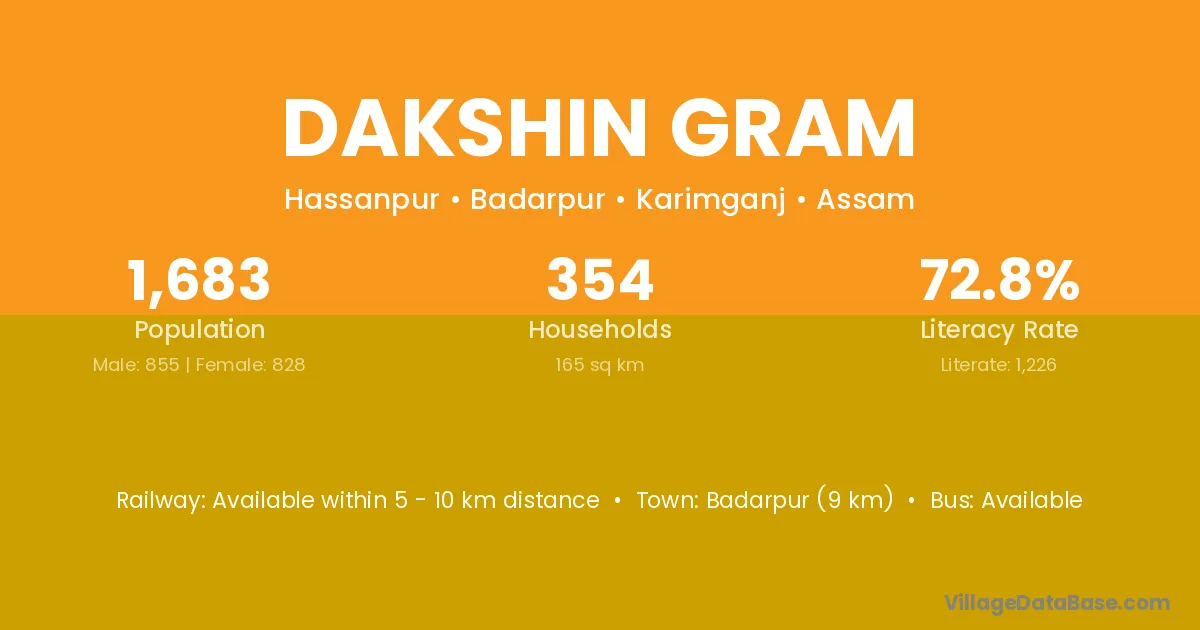 Badarpur (9 km) is the nearest town to Dakshin Gram village for major economic activities and is located approximately 9 km away.