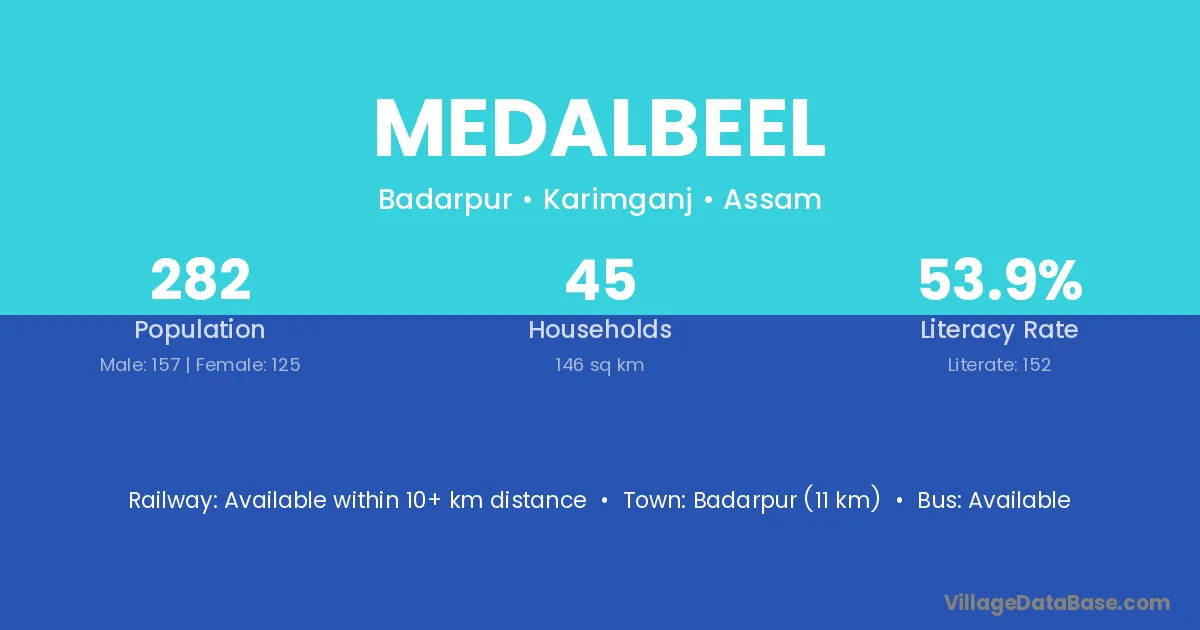 Badarpur (11 km) is the nearest town to Medalbeel village for major economic activities and is located approximately 11 km away.