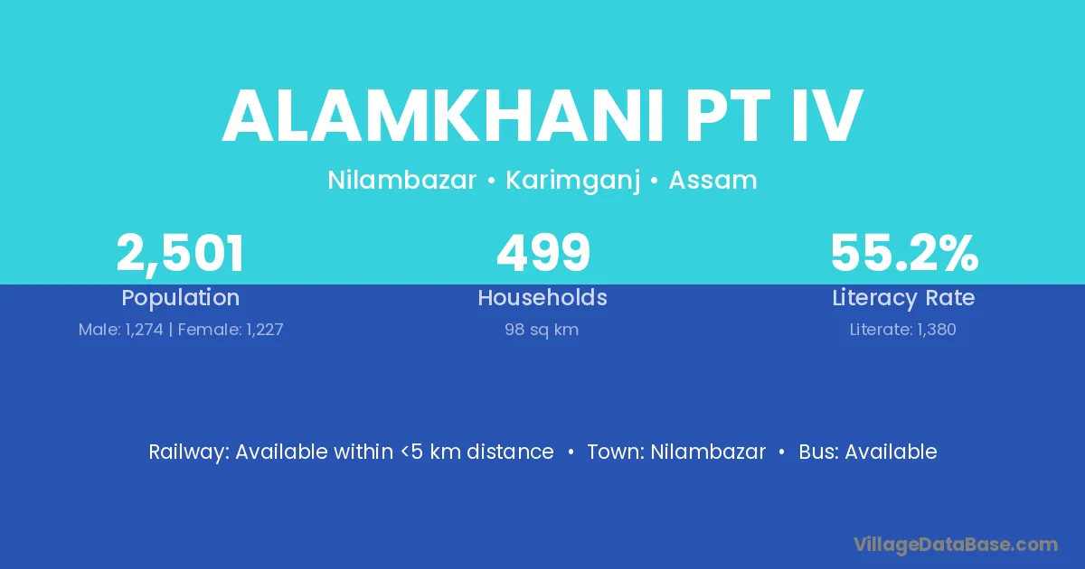 Alamkhani Pt Iv village has a total population of 2,501 people, of which 1,274 are males and 1,227 are females.
