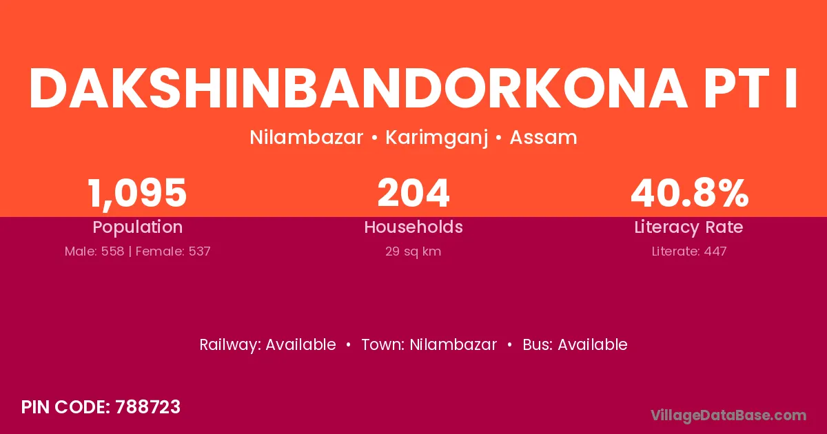 Dakshinbandorkona Pt I village has a total population of 1,095 people, of which 558 are males and 537 are females.