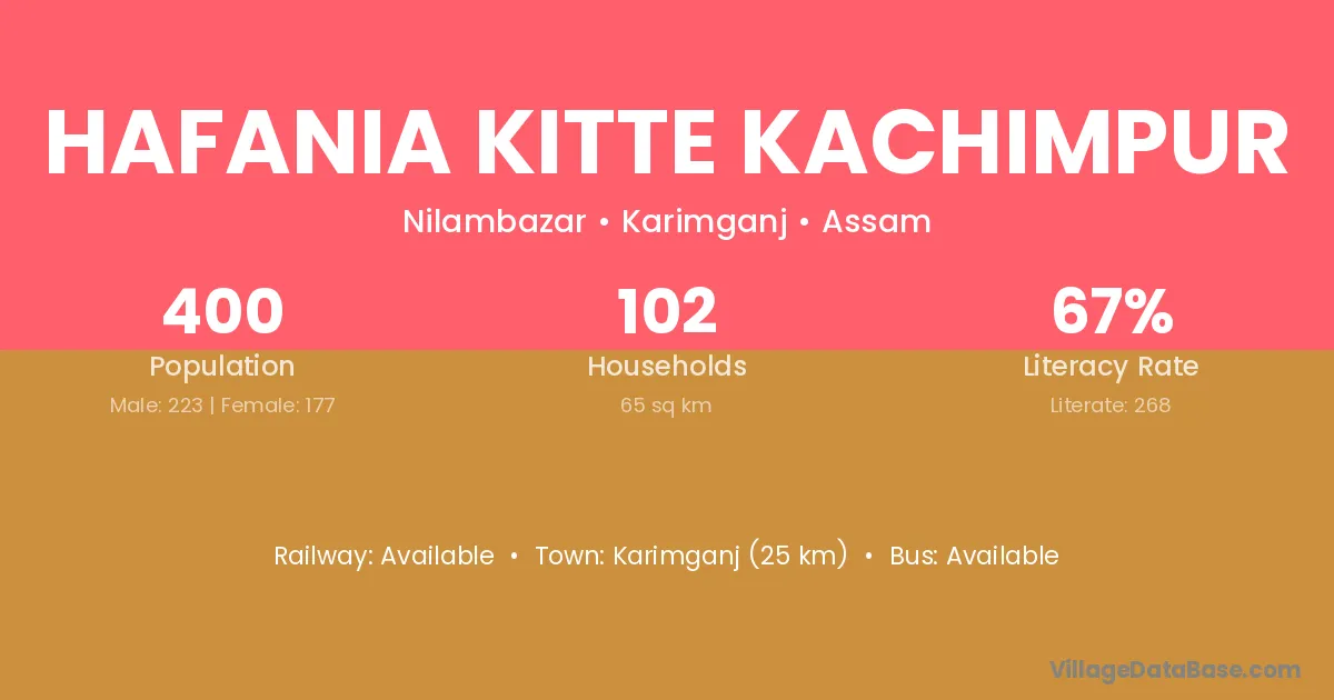 Karimganj (25 km) is the nearest town to Hafania Kitte Kachimpur village for major economic activities and is located approximately 25 km away.