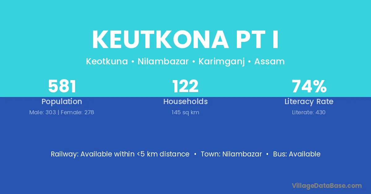 Keutkona Pt I village has a total population of 581 people, of which 303 are males and 278 are females.