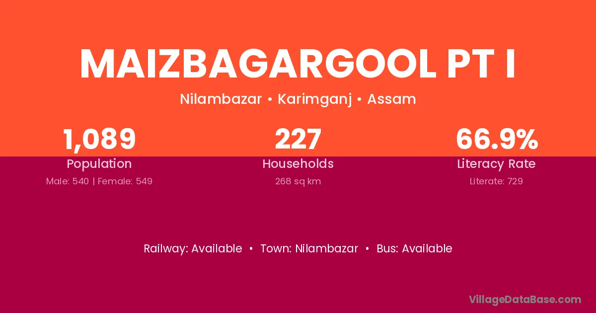 Maizbagargool Pt I village has a total population of 1,089 people, of which 540 are males and 549 are females.