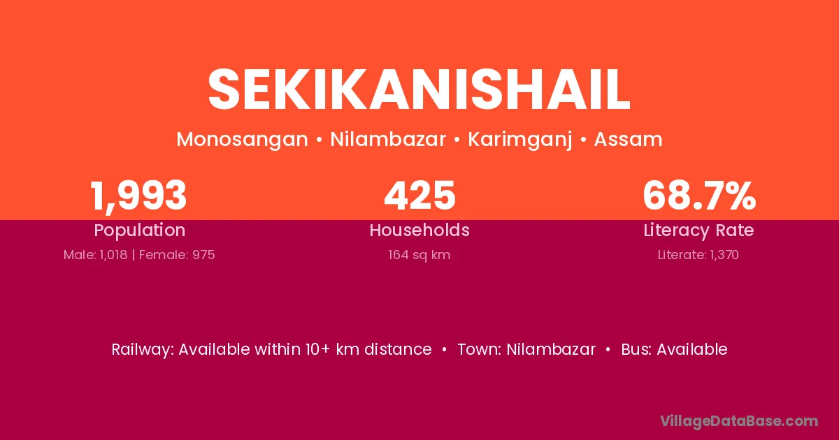Sekikanishail village has a total population of 1,993 people, of which 1,018 are males and 975 are females.