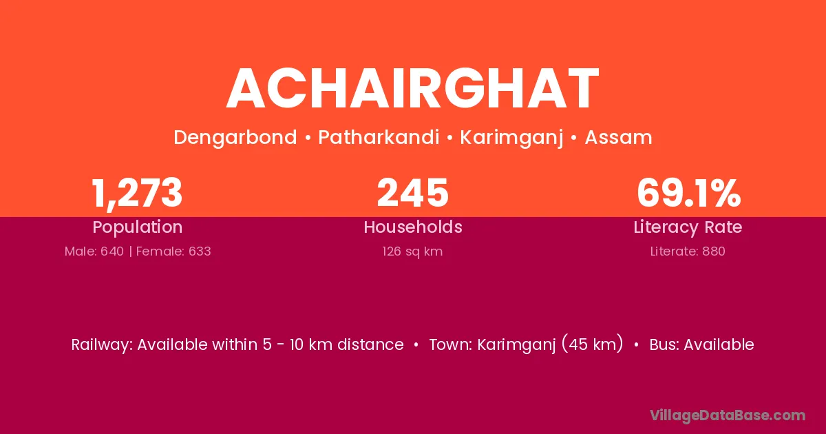 Karimganj (45 km) is the nearest town to Achairghat village for major economic activities and is located approximately 45 km away.