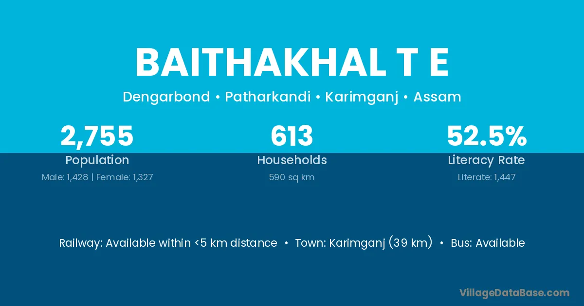 Karimganj (39 km) is the nearest town to Baithakhal T E village for major economic activities and is located approximately 39 km away.