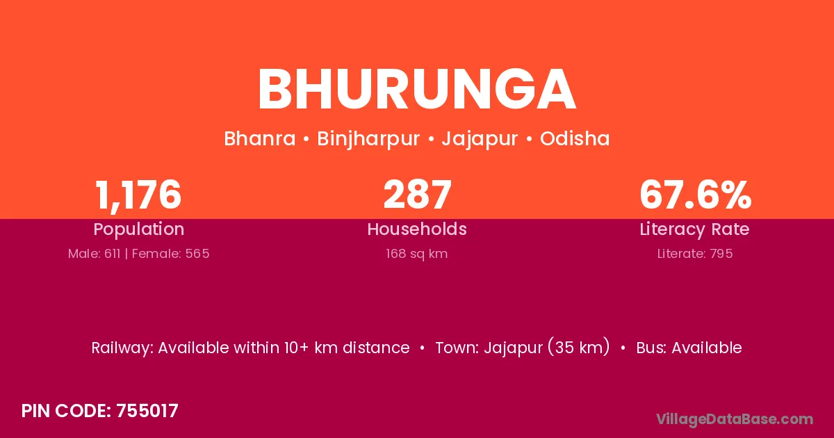 Bhurunga village has a total population of 594 people, of which 283 are males and 311 are females.