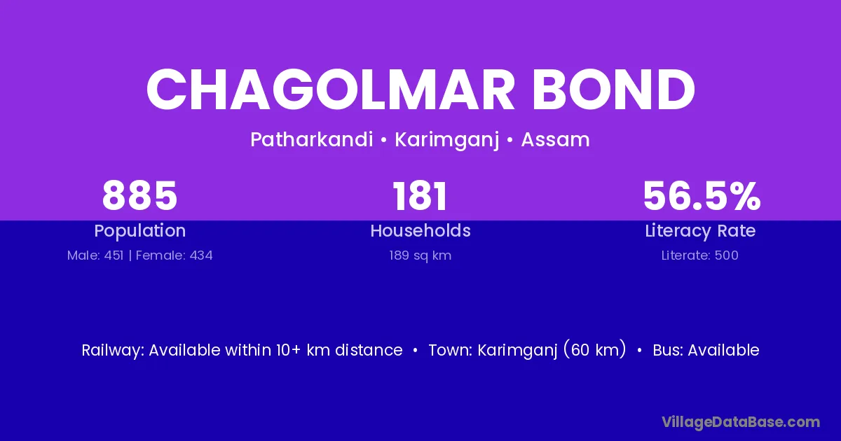 Karimganj (60 km) is the nearest town to Chagolmar Bond village for major economic activities and is located approximately 60 km away.