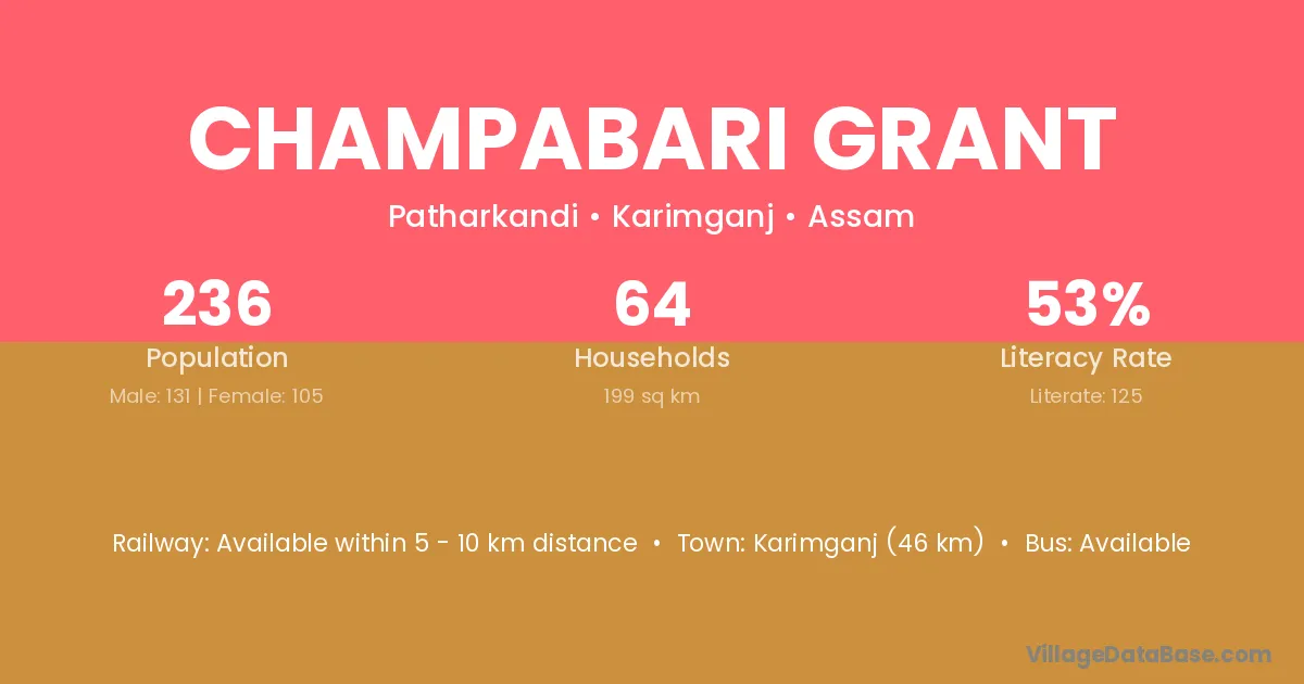 Karimganj (46 km) is the nearest town to Champabari Grant village for major economic activities and is located approximately 46 km away.