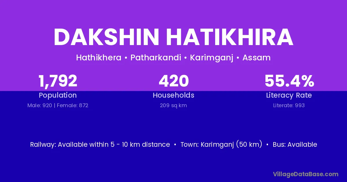 Karimganj (50 km) is the nearest town to Dakshin Hatikhira village for major economic activities and is located approximately 50 km away.