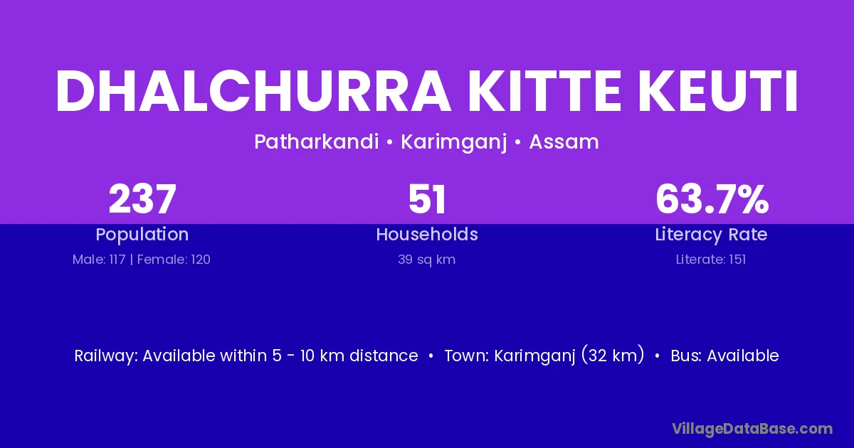 Karimganj (32 km) is the nearest town to Dhalchurra Kitte Keuti village for major economic activities and is located approximately 32 km away.