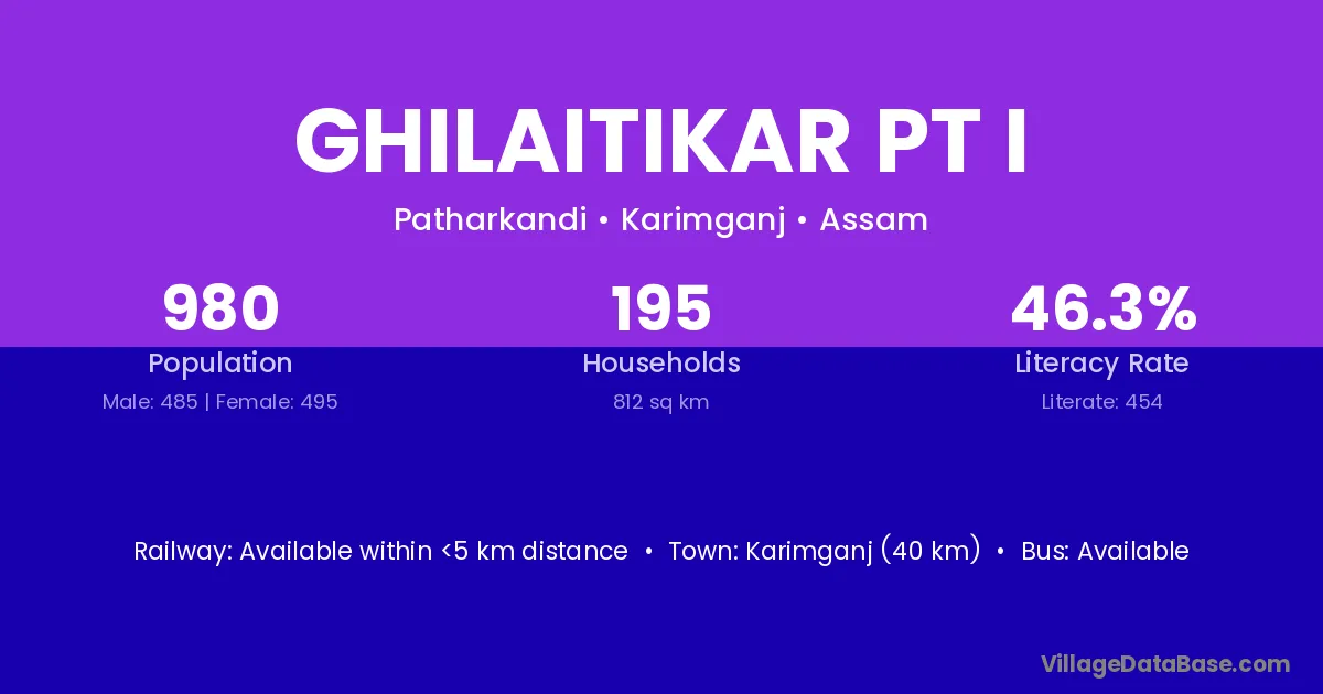 Karimganj (40 km) is the nearest town to Ghilaitikar Pt I village for major economic activities and is located approximately 40 km away.