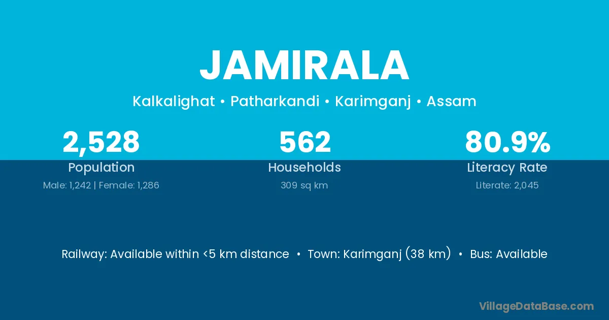 Karimganj (38 km) is the nearest town to Jamirala village for major economic activities and is located approximately 38 km away.