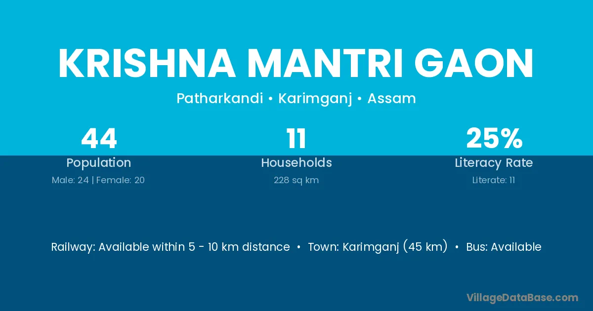 Karimganj (45 km) is the nearest town to Krishna Mantri Gaon village for major economic activities and is located approximately 45 km away.