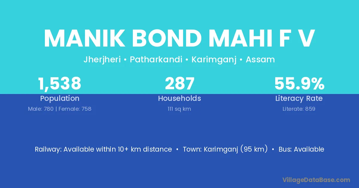 Karimganj (95 km) is the nearest town to Manik Bond Mahi F V village for major economic activities and is located approximately 95 km away.