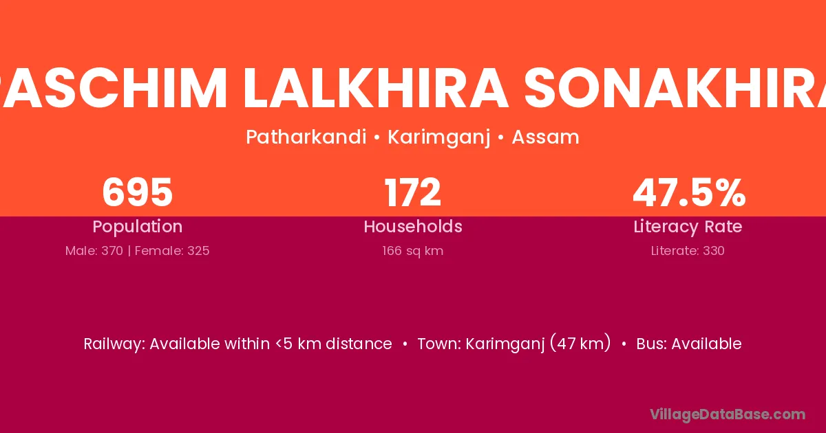 Karimganj (47 km) is the nearest town to Paschim Lalkhira Sonakhira village for major economic activities and is located approximately 47 km away.