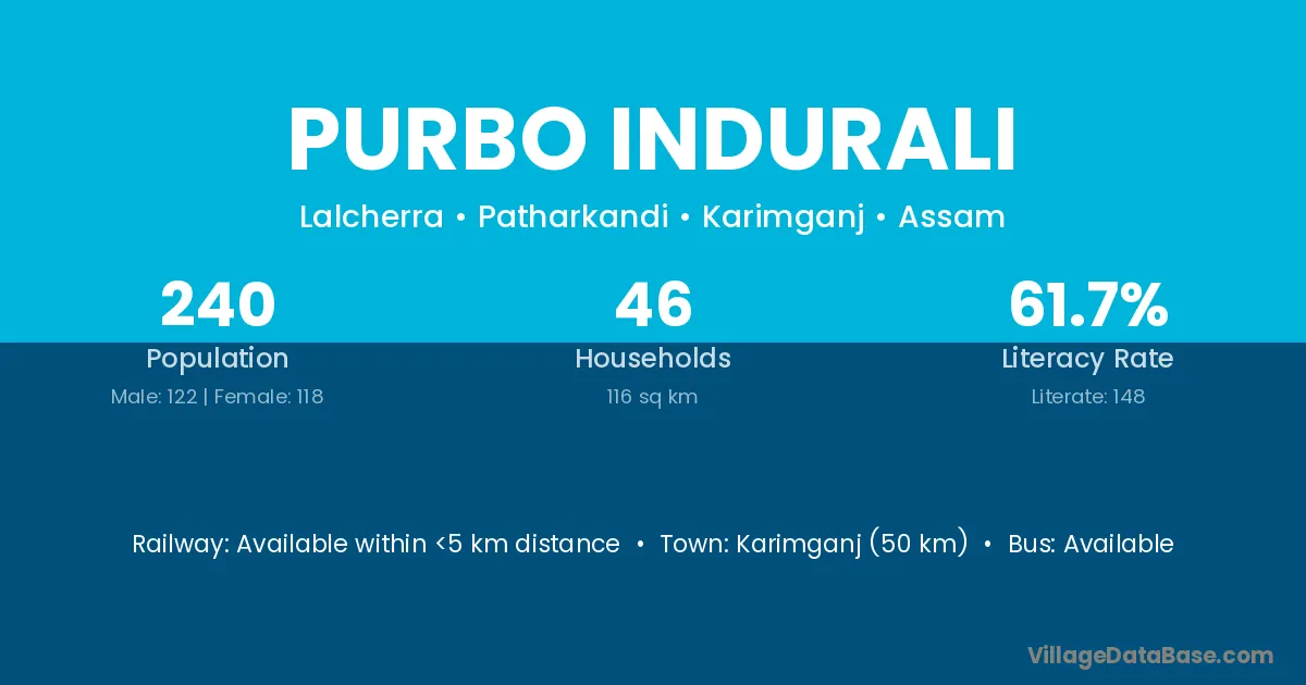 Karimganj (50 km) is the nearest town to Purbo Indurali village for major economic activities and is located approximately 50 km away.