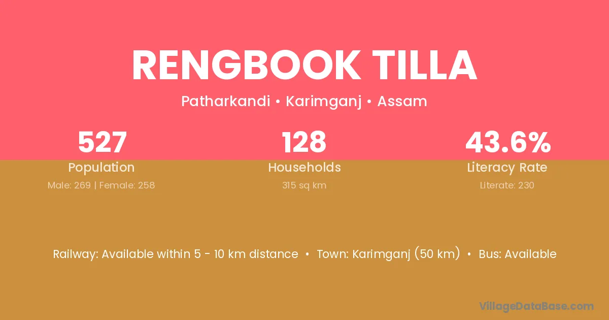 Karimganj (50 km) is the nearest town to Rengbook Tilla village for major economic activities and is located approximately 50 km away.