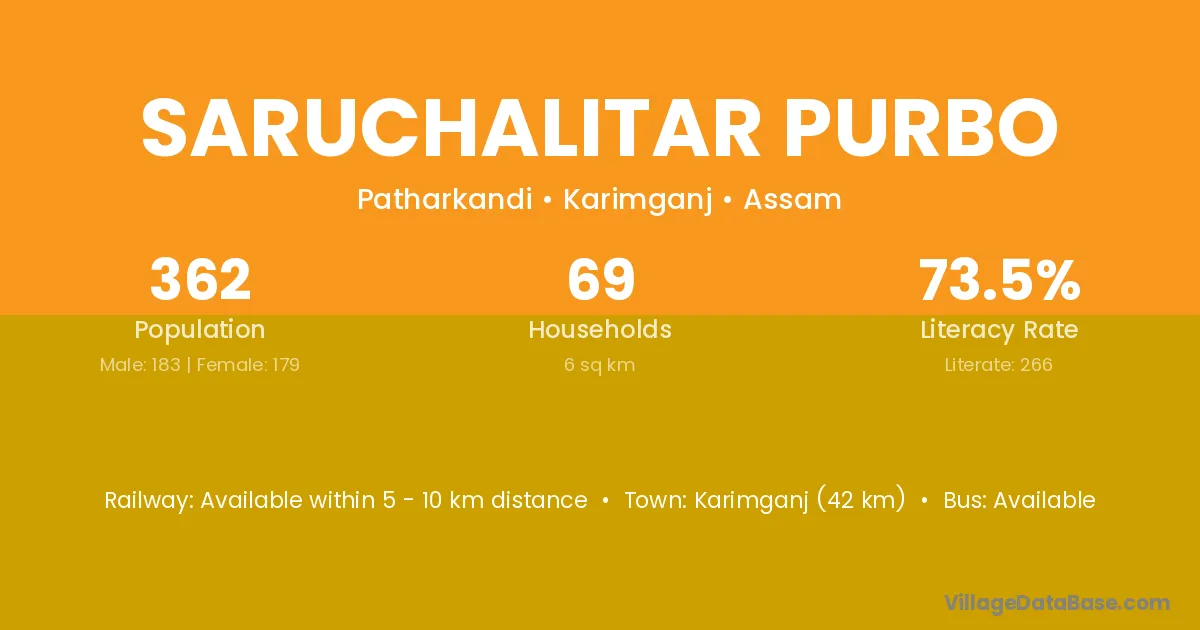 Karimganj (42 km) is the nearest town to Saruchalitar Purbo village for major economic activities and is located approximately 42 km away.