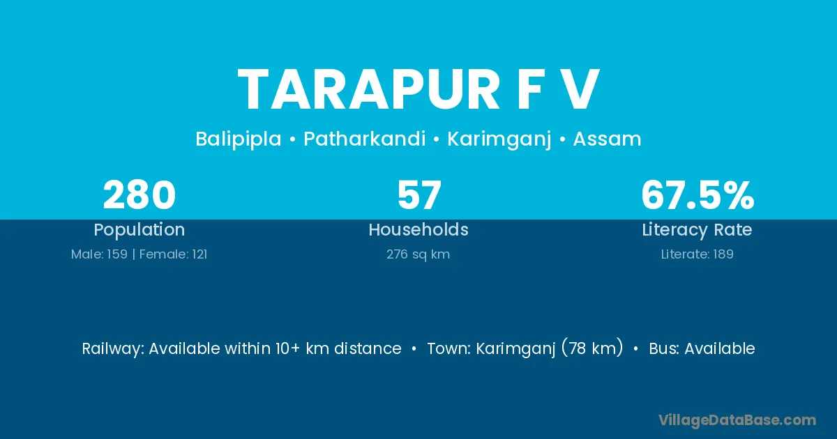Karimganj (78 km) is the nearest town to Tarapur F V village for major economic activities and is located approximately 78 km away.