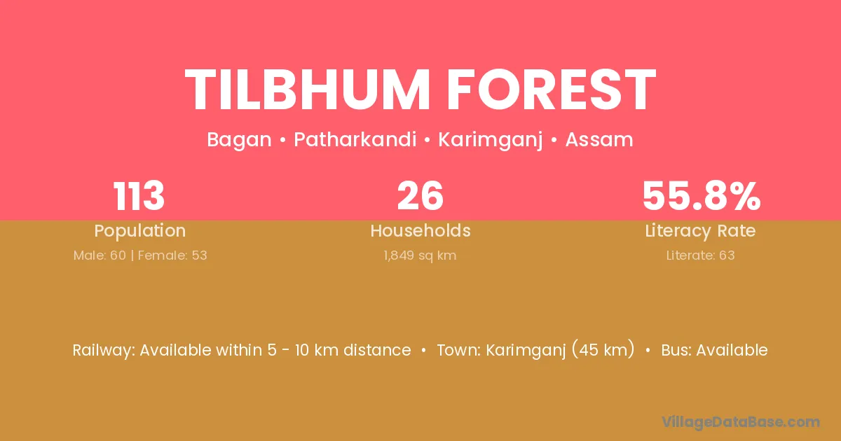 Karimganj (45 km) is the nearest town to Tilbhum Forest village for major economic activities and is located approximately 45 km away.