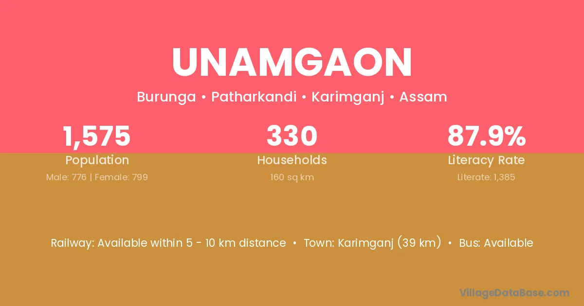 Karimganj (39 km) is the nearest town to Unamgaon village for major economic activities and is located approximately 39 km away.