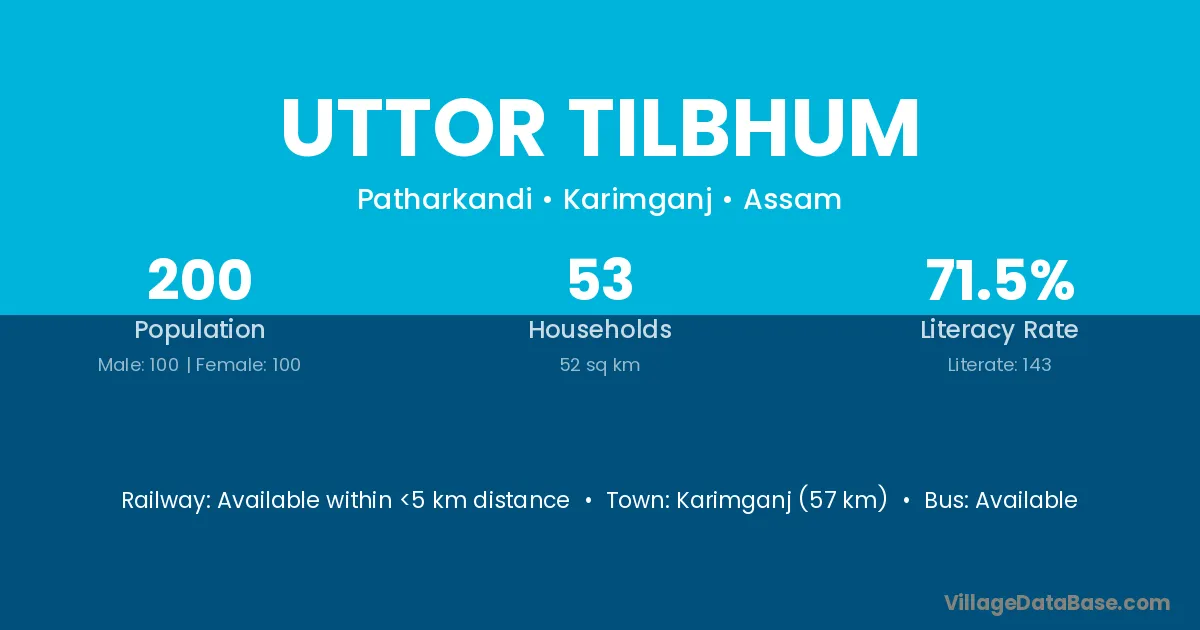 Karimganj (57 km) is the nearest town to Uttor Tilbhum village for major economic activities and is located approximately 57 km away.