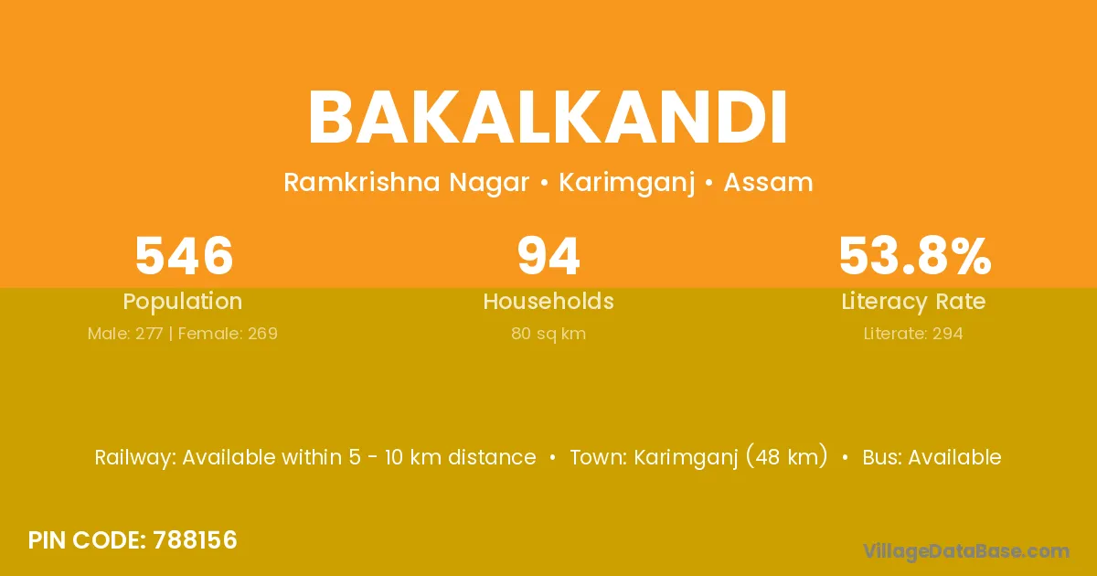 Karimganj (48 km) is the nearest town to Bakalkandi village for major economic activities and is located approximately 48 km away.
