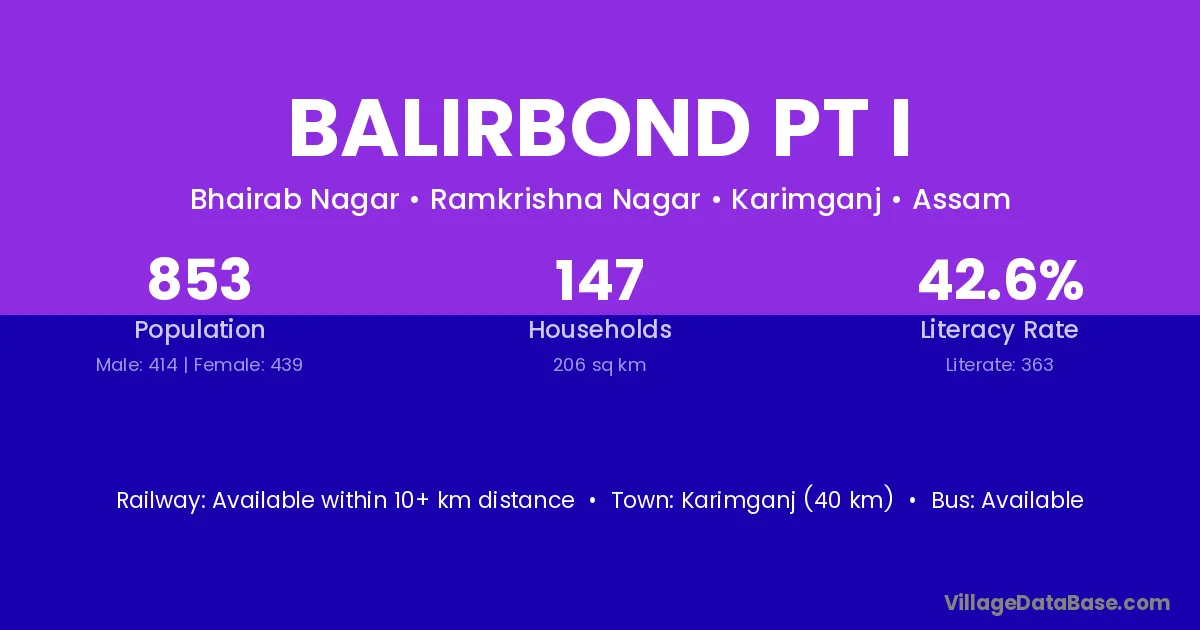Karimganj (40 km) is the nearest town to Balirbond Pt I village for major economic activities and is located approximately 40 km away.