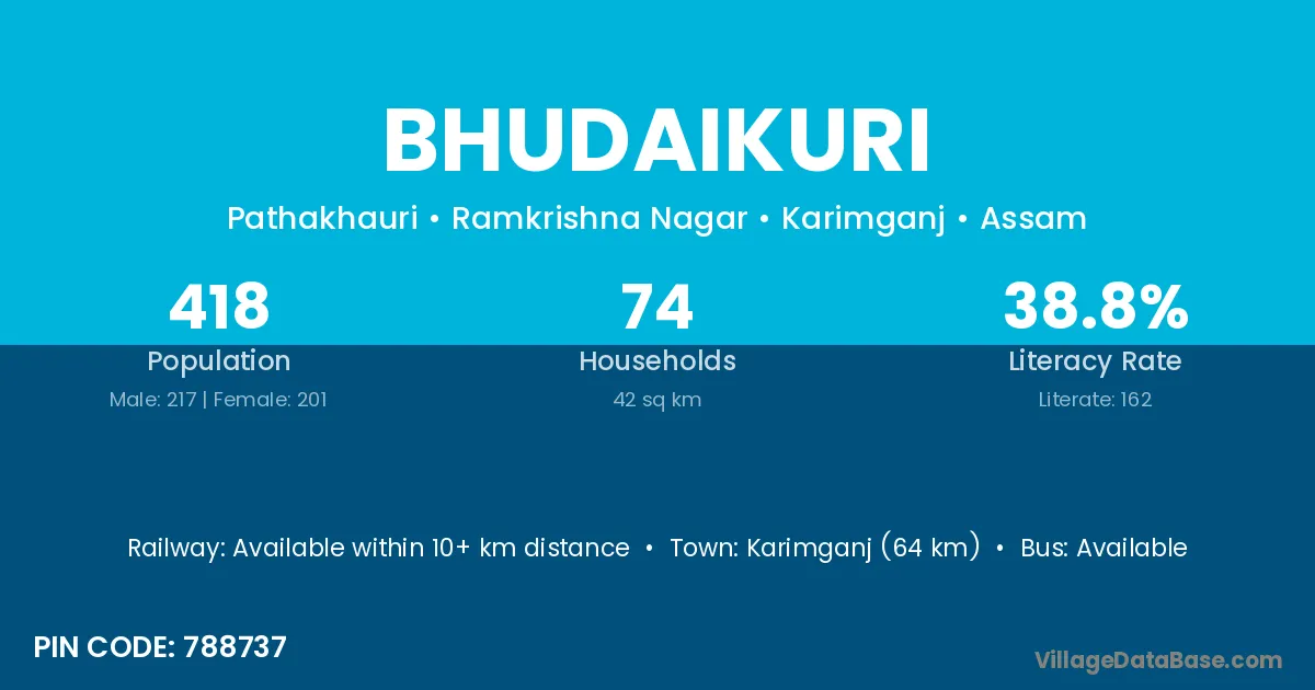 Karimganj (64 km) is the nearest town to Bhudaikuri village for major economic activities and is located approximately 64 km away.