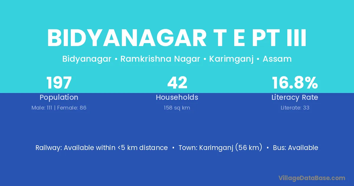 Bidyanagar T E Pt Iii village has a total population of 197 people, of which 111 are males and 86 are females.