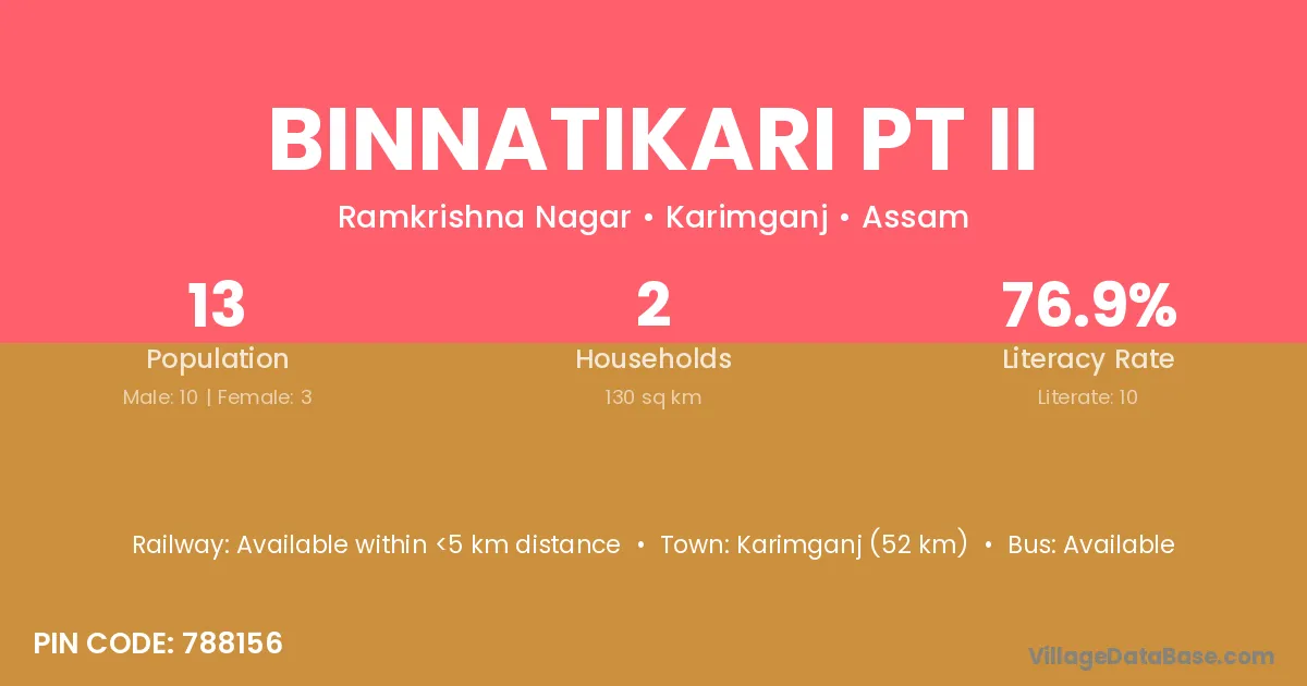 Karimganj (52 km) is the nearest town to Binnatikari Pt Ii village for major economic activities and is located approximately 52 km away.