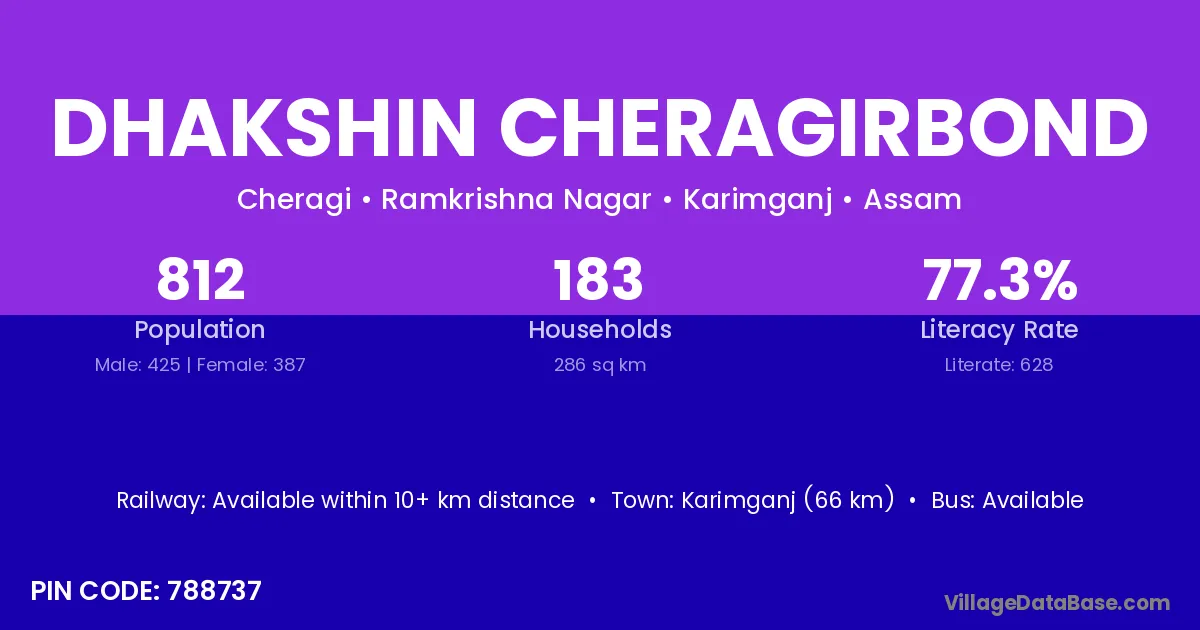 Karimganj (66 km) is the nearest town to Dhakshin Cheragirbond village for major economic activities and is located approximately 66 km away.