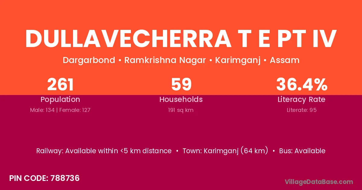 Karimganj (64 km) is the nearest town to Dullavecherra T E Pt Iv village for major economic activities and is located approximately 64 km away.