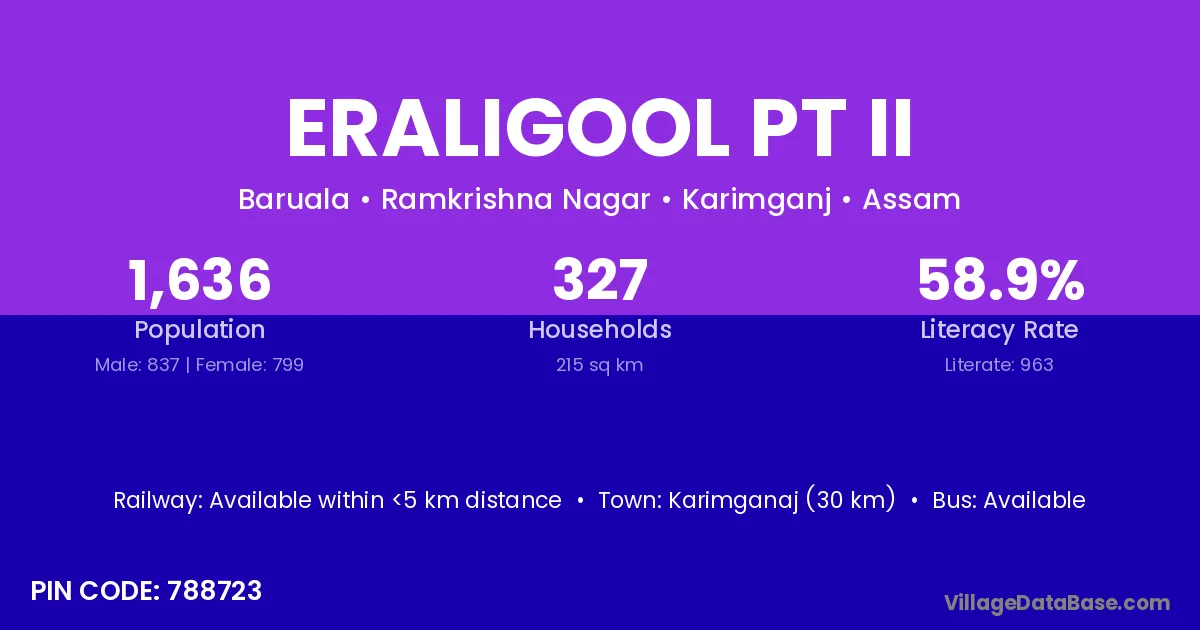 Karimganaj (30 km) is the nearest town to Eraligool Pt Ii village for major economic activities and is located approximately 30 km away.