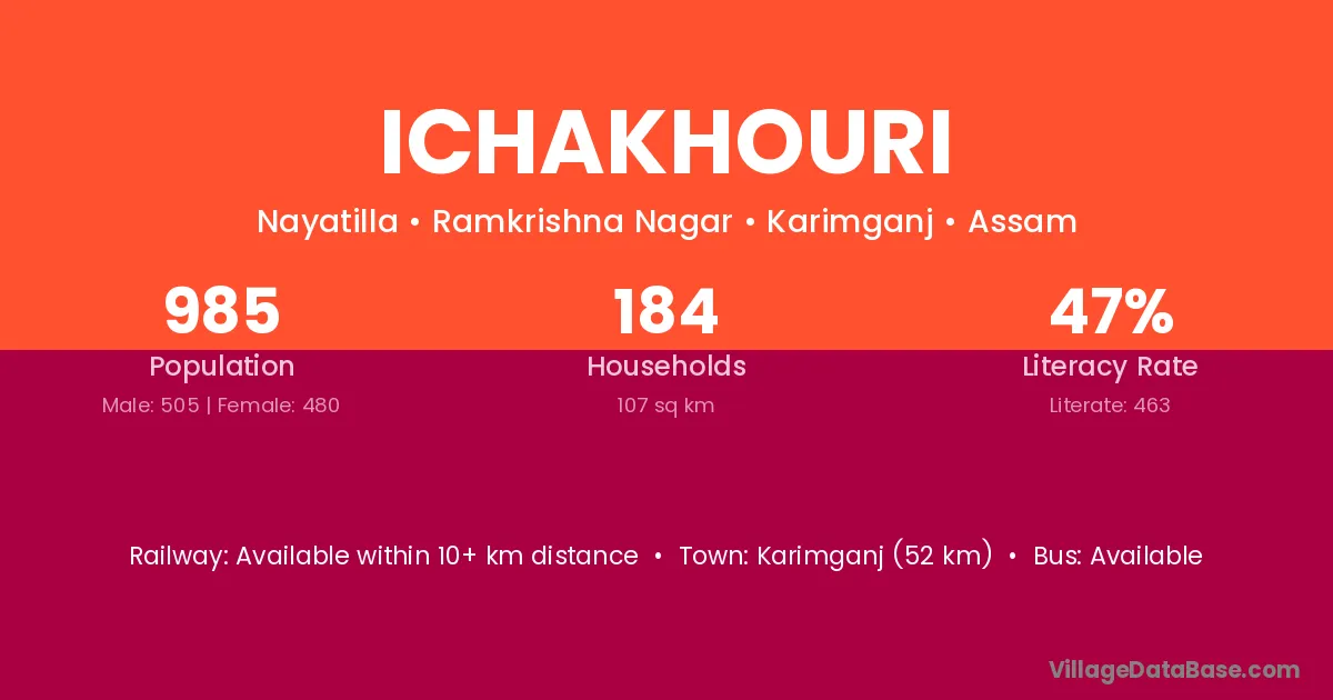 Karimganj (52 km) is the nearest town to Ichakhouri village for major economic activities and is located approximately 52 km away.