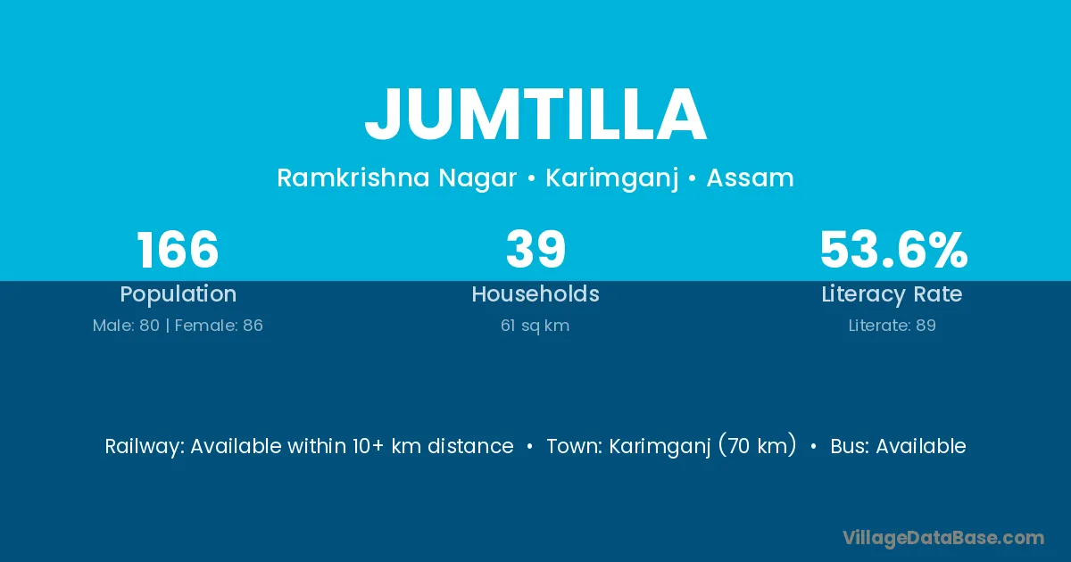 Karimganj (70 km) is the nearest town to Jumtilla village for major economic activities and is located approximately 70 km away.