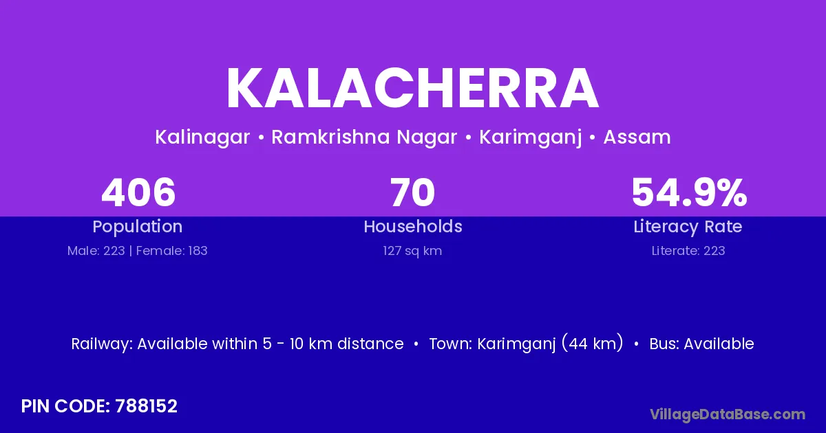 Karimganj (44 km) is the nearest town to Kalacherra village for major economic activities and is located approximately 44 km away.