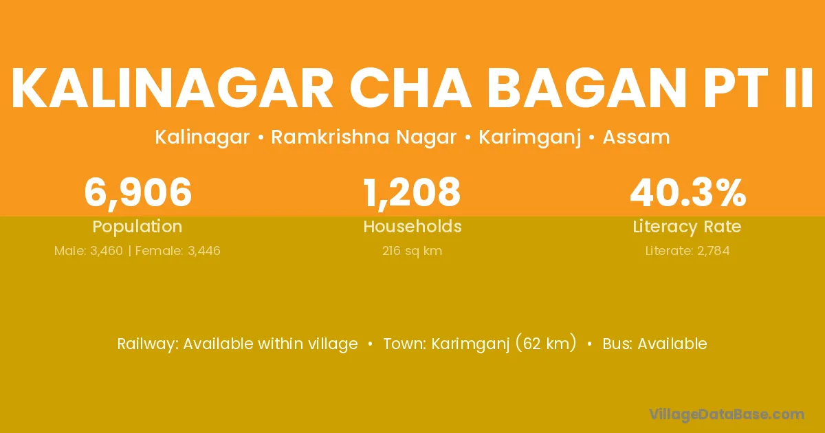 Kalinagar Cha Bagan Pt Ii village has a total population of 6,906 people, of which 3,460 are males and 3,446 are females.