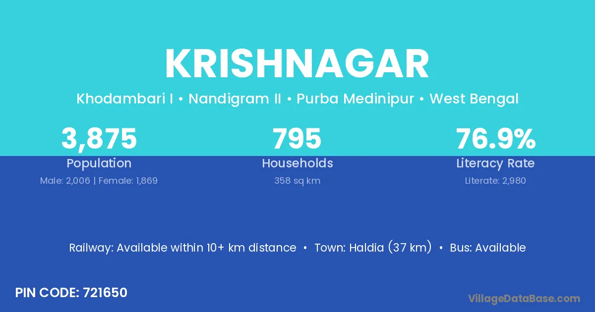 Karimganj (52 km) is the nearest town to Krishnagar village for major economic activities and is located approximately 52 km away.