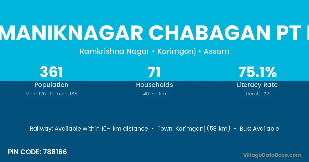 Karimganj (58 km) is the nearest town to Maniknagar Chabagan Pt I village for major economic activities and is located approximately 58 km away.