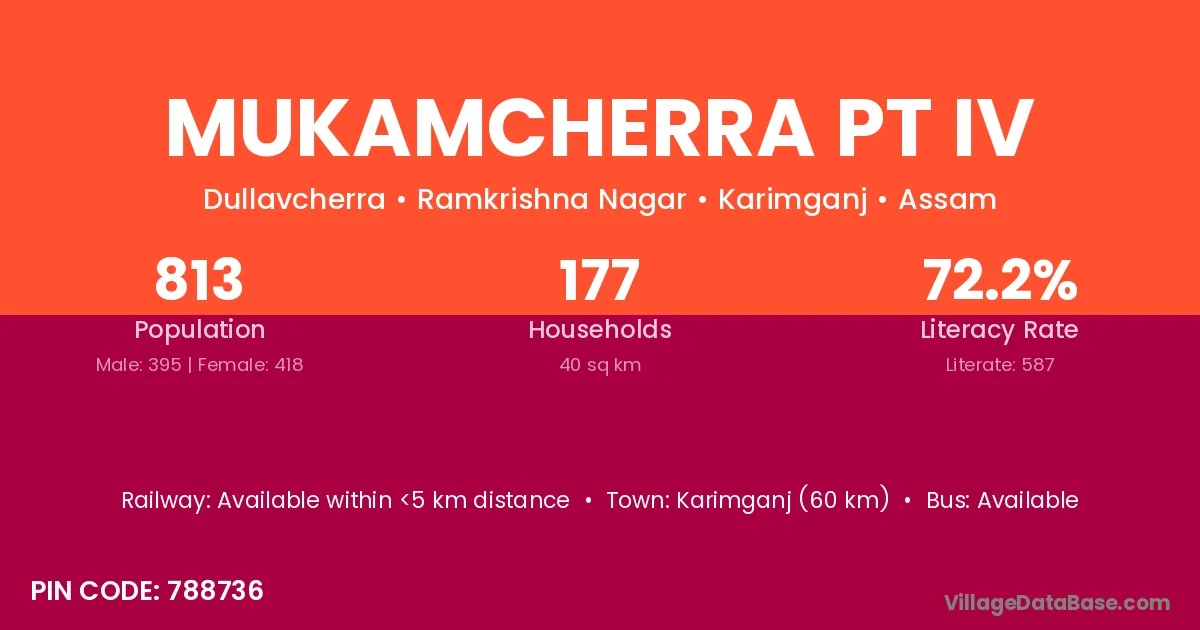 Karimganj (60 km) is the nearest town to Mukamcherra Pt Iv village for major economic activities and is located approximately 60 km away.