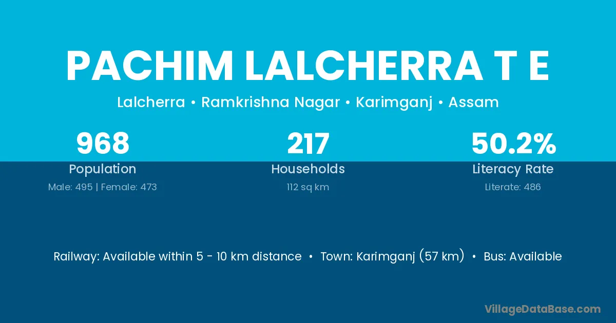 Karimganj (57 km) is the nearest town to Pachim Lalcherra T E village for major economic activities and is located approximately 57 km away.
