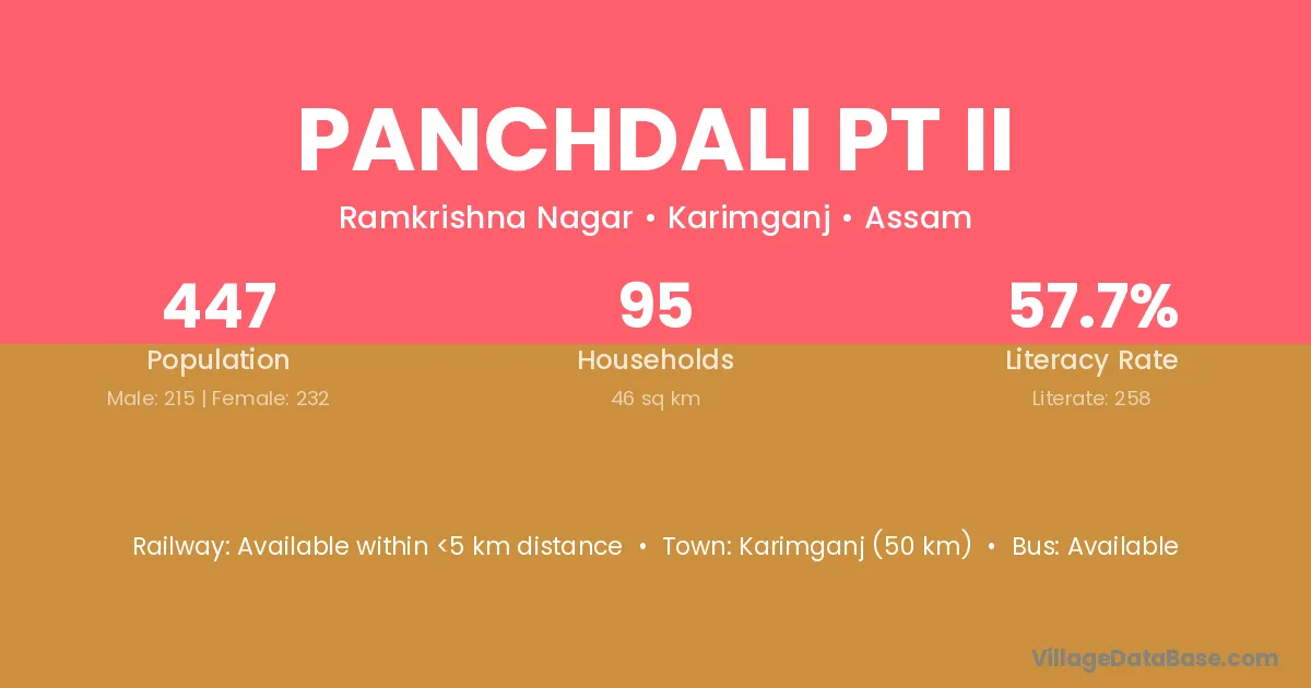 Karimganj (50 km) is the nearest town to Panchdali Pt Ii village for major economic activities and is located approximately 50 km away.