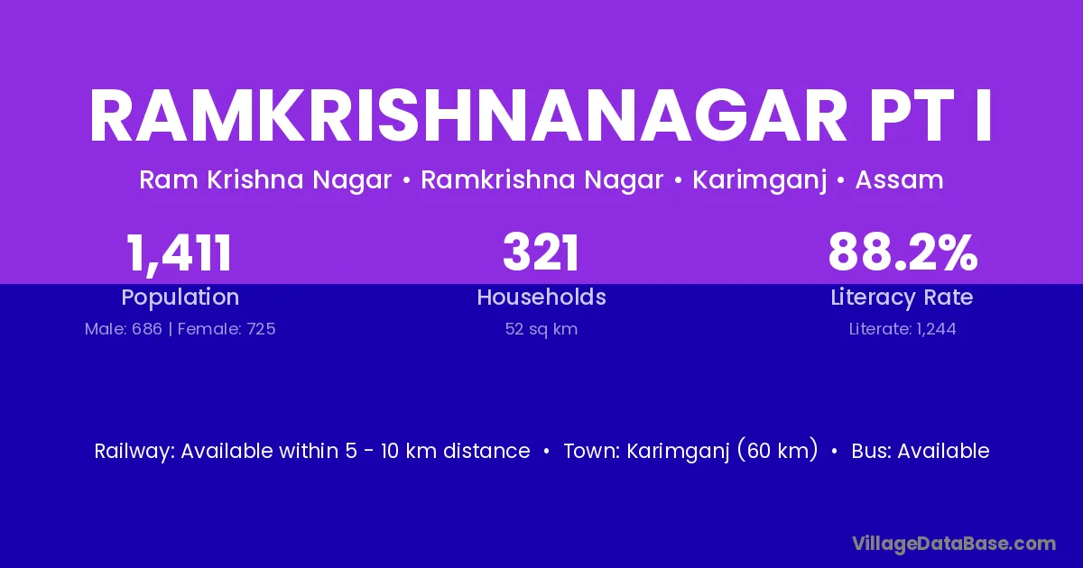 Karimganj (60 km) is the nearest town to Ramkrishnanagar Pt I village for major economic activities and is located approximately 60 km away.
