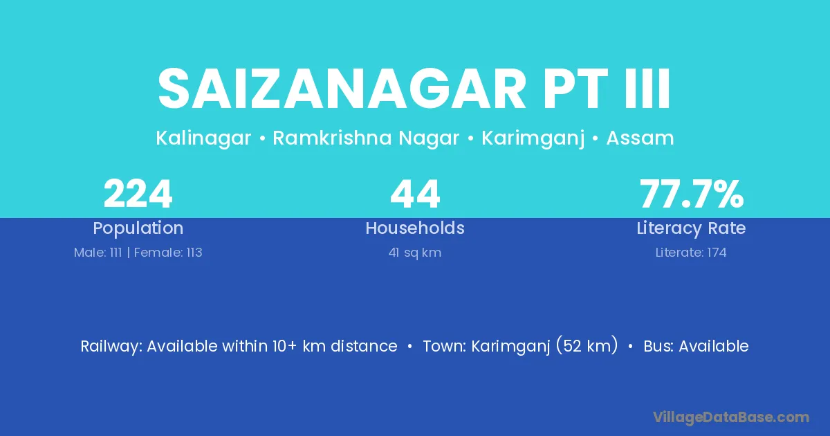 Karimganj (52 km) is the nearest town to Saizanagar Pt Iii village for major economic activities and is located approximately 52 km away.